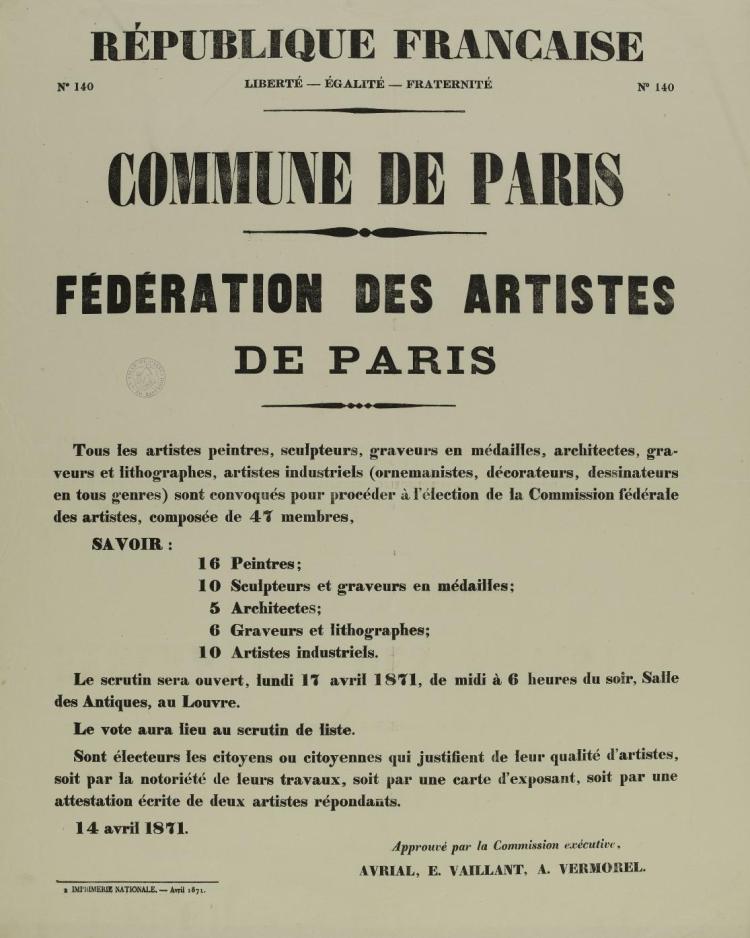 Il est probablement aussi l’un des 400 artistes présents dans le grand amphithéâtre de l’École de médecine le 13 Avril 1871, à l’invitation de Gustave COURBET. En effet, la révolte grondait depuis longtemps parmi les artistes « plasticiens » en raison des blocages de l’Académie sur l’accès au Salon annuel sans lequel il était impossible de se faire connaître. C’est donc pour réorganiser les Beaux-Arts et dans le but de « Confier aux artistes seuls la gestion de leurs intérêts » que va être fondée la Fédération des artistes de Paris ; son comité directeur comprenait, outre G. COURBET, des artistes illustres comme les peintres COROT, DAUMIER, Édouard MANET … ou encore le sculpteur Jules DALOU.