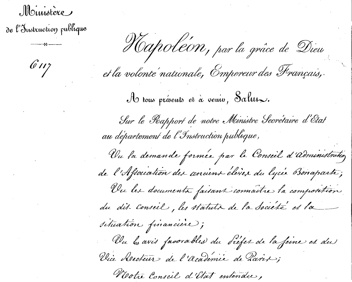 L’Association Amicale des Anciens Élèves du Lycée Condorcet a été fondée sous Napoléon III en 1859, et reconnue d’Utilité Publique le 13/11/1867. Un siècle et demi plus tard, elle est toujours active. Les Anciens Élèves sont la « mémoire » de l’établissement et l’Association aide à la pérennité de son esprit en faisant le lien entre passé, présent et futur.